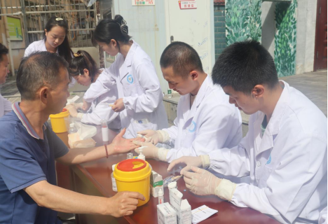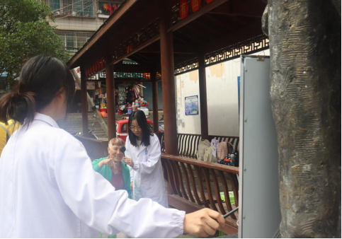 7月3日,医学技术学院 40 余名师生联合贵阳市白云区大山洞街道云晖社区居委会,开展医疗服务活动。志愿者们发挥专业所长,提供血型检测、血压血糖测量、视力及眼底筛查等服务,针对高血压、糖尿病等高发疾病给予个性化健康指导。规范的操作与耐心的态度赢得居民高度认可,既展现了学校教学成果,也让学生在基层实践中体会到专业价值与社会责任感。